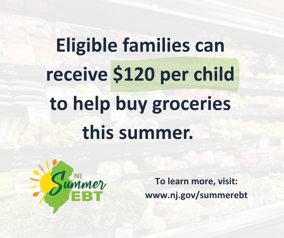 The Summer EBT Program provides eligible NJ families with $120 per child to help pay for groceries during the summer.